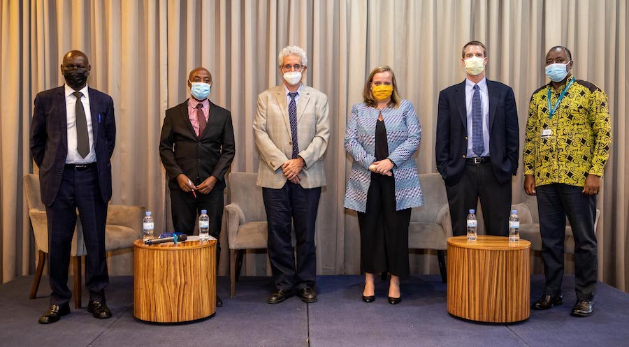 Speakers at the meeting (L to R): Dr. Cyprien Baribwira, Dr. Janvier Serumondo, Dr. Thierry Roels, Alexandra Hoagland, Dr. David Riedel, Dr. Jackson Sebeza